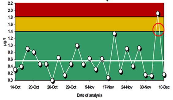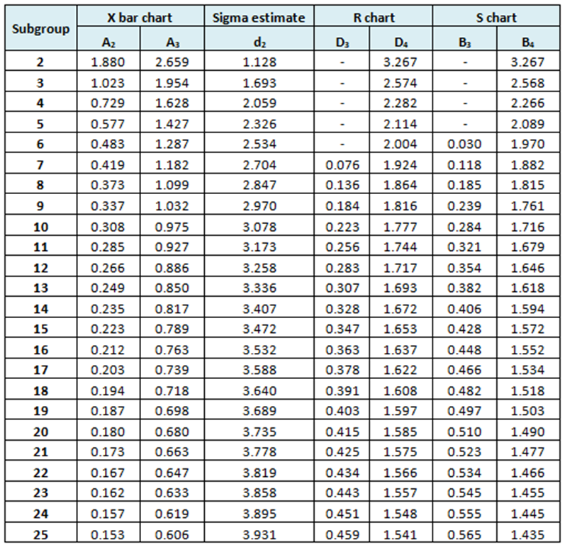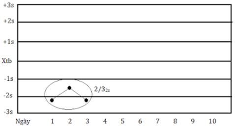 <p>​<strong>1. Các loại mẫu kiểm soát</strong></p><p>Tùy thuộc vào mục tiêu của biểu đồ kiểm soát các loại mẫu kiểm soát khác nhau có thể được sử dụng:&nbsp;<br />- Loại I: Chuẩn được chứng nhận (Certified Reference Material (CRM)&nbsp;<br />Kiểm soát cả sai số hệ thống và ngẫu nhiên, cung cấp thông tin về độ không đảm bảo đo (X chart hoặc R chart)<br />- Loại II: Chuẩn thẩm tra, chuẩn nội bộ. Các hóa chất để chuẩn bị cho các vật liệu khác nguồn với hóa chất để xây dựng đường chuẩn/hiệu chuẩn của phương pháp<br />Kiểm soát cả sai số hệ thống và ngẫu nhiên giống như mẫu loại I, cung cấp thông tin để tính độ lặp lại trung gian (X chart hoặc R chart)<br />- Loại III: Mẫu trắng<br />Phát hiện ra sự nhiễm bẩn, giám sát giá trị MDL (X chart)<br />- Loại IV: Mẫu thực<br />Kiểm soát độ lặp lại hoặc khi mẫu loại II không đủ bền như DO, nitrit (R chart)<br />&nbsp;<strong>2. Các loại biểu đồ kiểm soát</strong><br /><span style="background-color:rgb(255,255,255);">Trước khi xác định các giá trị đường giới hạn, cần có bộ số liệu đã thực hiện trong thời gian dài khảo sát (1 tháng) và phải có ít nhất trên 20 điểm kiểm soát</span><br /><strong>- Biểu đồ trung bình (X-bar chart) :&nbsp;</strong><br />Biểu đồ giúp kiểm soát độ đúng (sai số của phép thử). Kiểm soát mẫu trắng, độ thu hồi cũng có thể áp dụng loại biểu đồ này.</p><p style="text-align:center;"><img src="https://scem.org.vn/uploads/tin-tuc-trung-tam/2023_07/image.png" alt="" width="400" height="192" /></p><p>Đường trung tâm là giá trị trung bình (X<sub>tb</sub>) hoặc giá trị theo chứng nhận.<br />Các <i>“giới hạn cảnh báo</i>” <i>trên</i> (UWL) là X<sub>tb </sub>+ 2s và <i>dưới </i>(LWL) là X<sub>tb</sub> - 2s, nghĩa là 95% kết quả được phân bố trong khoảng giới hạn X<sub>tb </sub>± 2s<br />Các <i>“giới hạn kiểm soát hay giới hạn hành động”</i> <i>trên</i> (UCL hay UAL) là X<sub>tb</sub> + 3s, và <i>dưới</i> là X<sub>tb</sub> - 3s, nghĩa là 99,7% kết quả được phân bố trong khoảng giới hạn X<sub>tb </sub>± 3s<br /><strong>- Biểu đồ độ rộng (R chart):&nbsp;</strong><br />Biểu đồ giúp kiểm soát độ độ lặp lại<strong> </strong>của phép thử. Trục tung là độ rộng R (Range) được xác định là sai khác lớn nhất giữa các giá trị phân tích lặp lại (max-min). Khoảng R thường tỉ lệ thuận với nồng độ mẫu. Vì vậy, nếu nồng độ mẫu chọn phân tích lặp lại quá khác nhau giữa các mẻ phân tích (mẫu loại IV) thì sử dụng khoảng tương đối R% chart thay vì R chart. Biểu đồ này ưu tiên áp dụng cho thông số không có chất chuẩn hoặc chuẩn kém bền (nitrit, DO, Coliform), phải sử dụng chính mẫu thật.&nbsp;</p><p style="text-align:center;"><img src="https://scem.org.vn/uploads/tin-tuc-trung-tam/2023_07/image_1.png" alt="" width="350" height="203" /></p><p>Từ các khoảng R, tính được giá trị trung bình R<sub>tb&nbsp;</sub>chính là đường trung tâm.<br />Giới hạn cảnh báo: WL <strong>= </strong>1/3.R<sub>tb</sub><span style="background-color:white;color:rgb(51,51,51);"><strong>&nbsp;+ 2/3.D<sub>4</sub>.</strong></span>R<sub>tb</sub>&nbsp;<br />Giới hạn kiểm soát trên: UCL <strong>= </strong><span style="background-color:white;color:rgb(51,51,51);"><strong>D<sub>4</sub>.</strong></span>R<sub>tb</sub><br />Giới hạn kiểm soát dưới: LCL <strong>= </strong><span style="background-color:white;color:rgb(51,51,51);"><strong>D<sub>3</sub>.</strong></span>R<sub>tb</sub></p><p style="text-align:center;"><img src="https://scem.org.vn/uploads/tin-tuc-trung-tam/2023_07/image_2.png" alt="" width="500" height="484" /></p><p><strong>- Biểu đồ độ lệch chuẩn (S chart):&nbsp;</strong><br />Loại này có dạng gần giống R chart:<strong> </strong>Nếu có trên cỡ mẫu của tập con số liệu ≥9 (tất cả cùng số lần lặp và lặp trên 9 lần) thì thay biên độ R bằng độ lệch chuẩn S và phối hợp cả X-bar thành cặp Xbar-S chart như sau:<br />&nbsp; &nbsp; &nbsp; &nbsp; &nbsp; &nbsp; Đối với X-bar chart: &nbsp;&nbsp;UCL<strong> = </strong>X<sub>tb</sub> + A<sub>3</sub>.S &nbsp;&nbsp;;&nbsp;&nbsp; LCL = X<sub>tb</sub> - A<sub>3</sub>.S<br />&nbsp; &nbsp; &nbsp; &nbsp; &nbsp; &nbsp; Đối với S chart:<strong>&nbsp; &nbsp; &nbsp; &nbsp; &nbsp; &nbsp; &nbsp; &nbsp; &nbsp;</strong>UCL = B<sub>4</sub>.S&nbsp;&nbsp; &nbsp;;&nbsp;&nbsp; &nbsp;LCL = B<sub>3</sub>.S</p><p style="text-align:center;"><img src="https://scem.org.vn/uploads/tin-tuc-trung-tam/2023_07/image_9.png" alt="" width="400" height="267" /></p><p><br /><strong>3. Bốn quy tắc kiểm tra biểu đồ kiểm soát (quy tắc Westgard, ISO 13530):&nbsp;</strong><br />Ngoài kiểm tra 2 lỗi vượt<strong> </strong>giới hạn cảnh báo và kiểm soát, cần lưu ý theo dõi thêm:</p><ul><li><p style="text-align:justify;"><strong>Qui tắc 2<sub>2s</sub></strong>: 2 giá trị liên tục nằm giữa giới hạn cảnh báo và kiểm soát (biến thể quy định khác: 2 trong 3 giá trị liên tục)</p></li></ul><figure class="table" style="width:623px;"><table style=";"><tbody><tr><td style="border:1px solid black;padding:0cm 7px;vertical-align:top;width:297px;"><img src="https://scem.org.vn/uploads/tin-tuc-trung-tam/2023_07/image_3.png" alt="" width="350" height="216" /></td><td style="border-bottom:1px solid black;border-left-style:none;border-right:1px solid black;border-top:1px solid bla